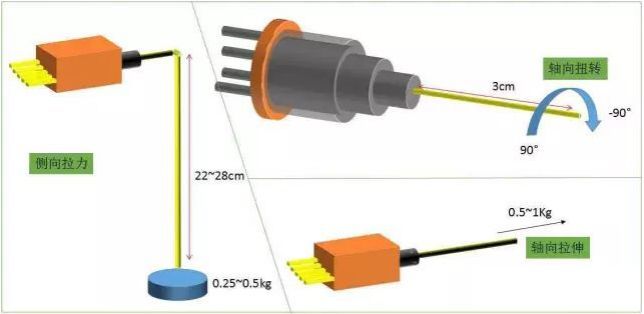 根據(jù)尾纖受力形式不同,分為軸向扭轉(zhuǎn)、側(cè)向拉力、軸向拉力。主要參數(shù)就是施加力的大小和施加力的次數(shù)或時(shí)間。力的大小和受力次數(shù)(時(shí)間)是根據(jù)光纖是025帶涂覆層光纖、松套光纖(如09松套)、緊套光纖(09緊套),還是加強(qiáng)型光纖(如3mm中間填絲線保護(hù)光纖)而定。