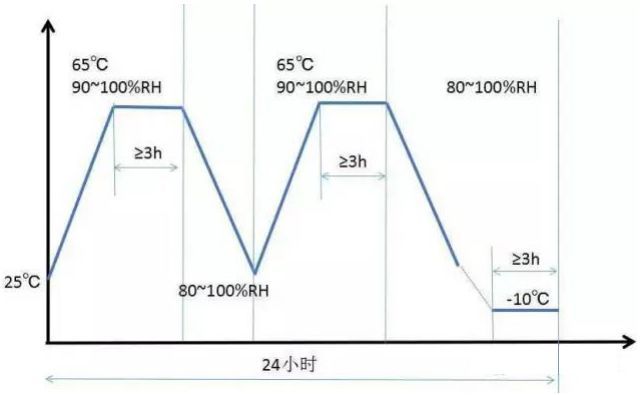 濕度和溫度同時(shí)變化條件下的可靠性實(shí)驗(yàn),有可能會(huì)產(chǎn)生水汽凝結(jié)或者結(jié)霜。這個(gè)實(shí)驗(yàn)僅僅針對(duì)室外應(yīng)用的器件和模塊。該實(shí)驗(yàn)的溫濕度控制曲線如下圖,要做20個(gè)循環(huán),一個(gè)循環(huán)下來要24小時(shí);至少有一半的循環(huán),*后一步要降到-10℃,停留不少于3h。