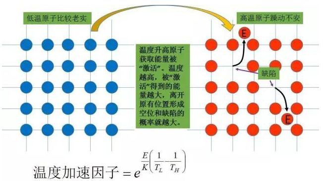 溫度越高,原子平均能量就越大,原子離開自己原有位置,形成缺陷的概率就越大。一切與溫度相關(guān)的加速失效都滿足方程Arrhenius方程。