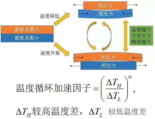 溫度循環(huán)會(huì)導(dǎo)致不同膨脹系數(shù)的材料受到循環(huán)應(yīng)力,溫差越大,循環(huán)應(yīng)力的峰值越大,對(duì)結(jié)構(gòu)的疲勞損傷就越強(qiáng)烈。因此溫度加速因子實(shí)際上是循環(huán)應(yīng)力引起的加速失效。